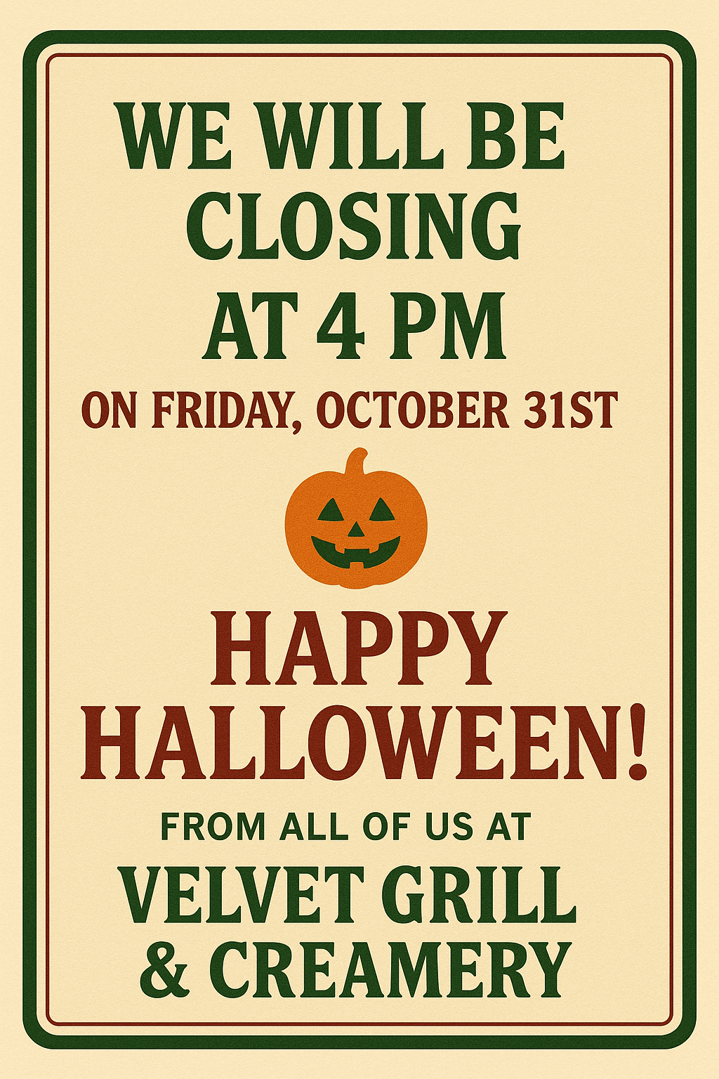 Sign for Velvet Grill and Creamery offering breakfast, lunch, and dinner.